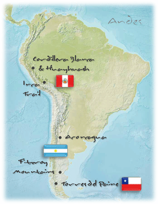 The Andes Mountains are the spine of South America, dominating the western edge of the continent for 7000km from it's northern Colombian coast to the tip of Patagonia in the south. Along the way is a range of trekking destinations and experiences showing the kind of diversity for which South America is renowned. These cater for people of all abilities, from the extremely tough ascent of Aconcagua (the highest mountain outside the Himalayas) and the circuits of the Peruvian cordilleras to the more accessible, but no less stunning, national parks of Patagonia. And not forgetting one of the world's classic treks - hiking to the ancient Inca Trail to Machu Picchu. Click on each trekking destination for more details and tours.