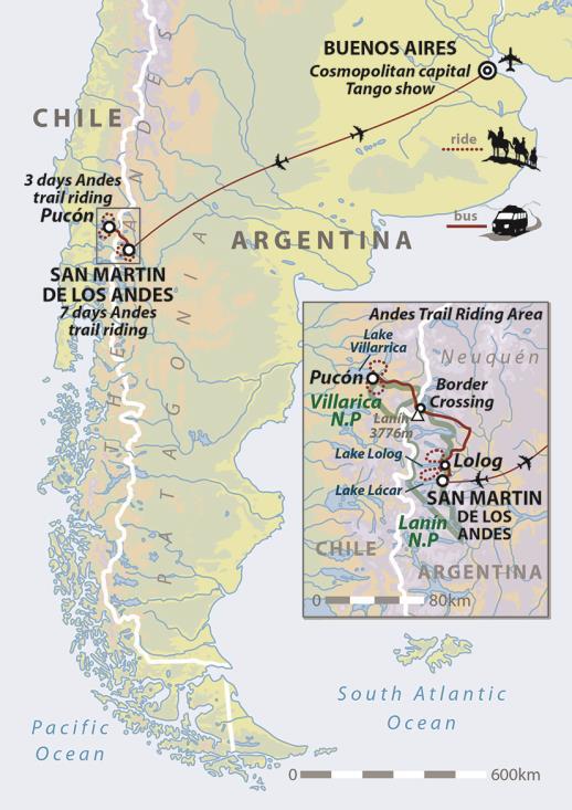 from £4250 excl. flights* The wild landscapes of Patagonia encompass the southern tip of Argentina and Chile. One of the world's most stunning natural settings, these beautiful vistas provide the backdrop for this spectacular ride through the Andean landscapes.Starting in Buenos Aires, we'll have a chance to experience one of Latin America's most captivating cities, before travelling on to the serene setting of San Martin de los Andes and Lanin National Park. Here we'll spend four days riding amongst a landscape of verdant valleys and high mountains, camping beneath the stars and enjoying home cooked food over open fires. Crossing the border into neighbouring Chile we'll then swap the green hills for lush rainforest and snow-capped volcanoes, as we make our way to Pucon, on the shores of Lake Villarrica.A unique opportunity to enjoy the contrasting landscapes and cultures of these two beautiful countries, our journey then ends back in the Argentinean capital, where a Tango show finishes off this remarkable adventure. |