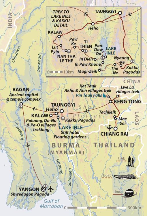 from £1895 excl. flights* ![]() During 2 weeks in Burma (Myanmar) we will seek out many of the acknowledged highlights, but also take time to get off the beaten track on a 4-day hike through the forest and farmland of the hill-country north of Inle Lake. We start our journey in the capital city of Rangoon (Yangon), with its magnificent, golden Schwedagon Pagoda. From here, we fly north to Heho and visit the collection of Buddhist stupas at Kakku, before spending a couple of days on an around Inle Lake, home to floating villages and fishermen with conical nets and a distinctive style of 'foot-rowing'. After our trek from Pindaya to Kalaw, via hill-tribe villages and monasteries, we make the short hop to the former royal capital, Mandalay. Here, our sightseeing tour will include a boat trip to the giant bell at Mingun and a sunset stroll along the 1200 metre-long teak bridge at U Bein. An unforgettable day's journey by boat down the Irrawaddy then takes us to Bagan, one of the outstanding highlights of the region thanks to its many hundreds of ancient temples, scattered across a tree-studded plain. This largest and most diverse of SE Asian countries has the power to surprise, with its amazing variety of landscape, cultural richness and charming people. KE's Position on Travel and Tourism in BurmaOff-limits for 15 years, the National League for Democracy (Aung San Suu Kyi's political party) announced in early November 2010 that the boycott on tourism should be lifted. With the general message from the Burmese people also encouraging outside visitors, we made the decision to set up our first ever holiday in Burma. From the outset, we were careful to design the itinerary with the help of a Burmese agent who, as much as is possible, makes use of independent and privately-run businesses, rather than those run by the military regime. We feel that it is appropriate now to let KE clients have the chance to make their own minds up about this fascinating and fast-changing country and believe that tourist visits by well-informed people, who have an interest in Burma's social and political issues, can be of benefit to the Burmese people. |