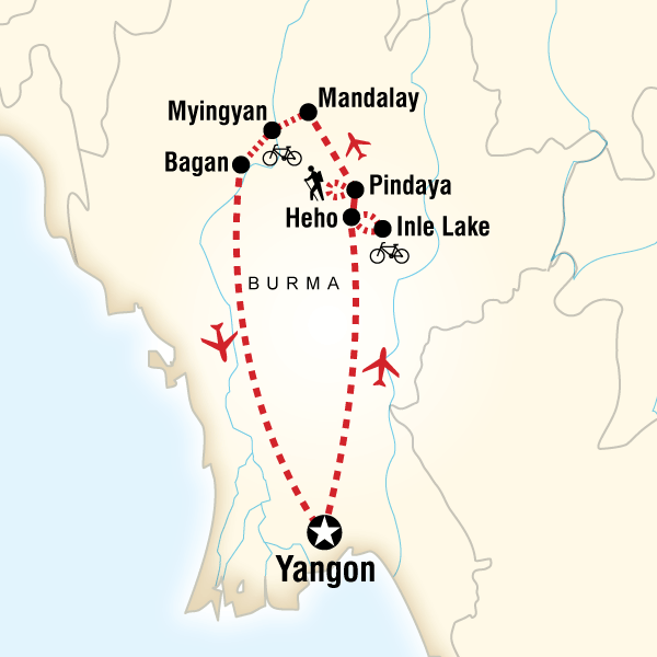 from £2995 excl. flights* ![]() We begin this cycling holiday in Burma with a visit to the awe-inspiring Schwedagon Pagoda in the capital city of Yangon. Our adventure continues with an exploration by bike in the cool highlands around the former hill-station of Kalaw. At an elevation of around 1300 metres, we take our first ride amongst the Palaung, Intha and Shan villages that are a feature of this partly forested upland area. We then head down to the wondrous Inle Lake and embark on a relaxing full day boat trip where we can marvel at the Intha fishermen, who famously manage to row with their legs. Throughout our time in Burma, we can expect to be greeted by warm, friendly people who have, as yet, relatively little experience of meeting foreign travellers, let alone cyclists. Crossing the Shan Plateau to Mandalay, a city made famous by one of the greatest of Kipling's poems, we can bike to the towns of Sagaing and Mingun on opposite sides of the Irrawaddy River. We will visit the famous U Bein teak bridge and the Mingun Bell and take a boat ride on the river. Then, after a welcome free day in Mandalay, we ride south through the ancient Ava Kingdom and pay a visit to the unique, hill-top temple of Mount Popa, before continuing our journey on a snaking mountain road to Bagan. We spend a day here, exploring amongst the hundreds of temple - by bike. Watching the sunset from a prime viewpoint at Bagan will leave you with memories to last a lifetime. Travelling by bike allows us to see the very best of Burma and to strike up a rapport with the people we meet along the way. |