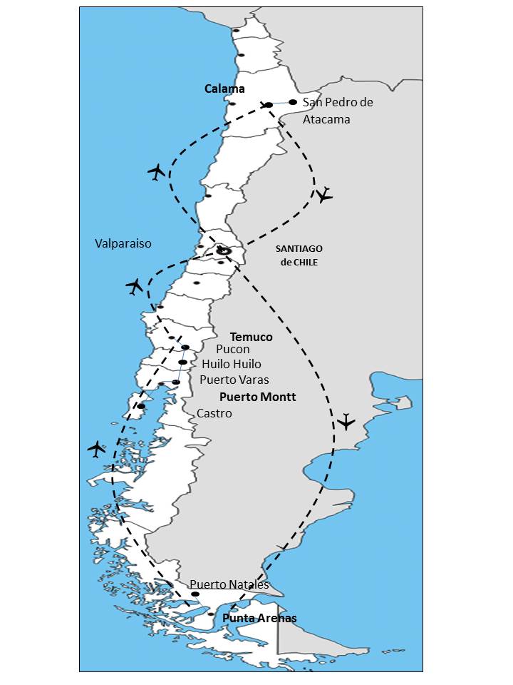 ![]() | Highlights - A full day in Estancia, experiencing the “huaso” culture - The National Park Torres Del Paine - The Araucarias forest of the National Park of Huerquehue - The Huilo Huilo biological reserve - Hike to the top of Villarica Volcano - The fauna and altiplanic lagoons of the Los Flamencos National Reserve - Sunrise at Tatio geysers - Breath-taking sunset overlooking the Moon Valley. |