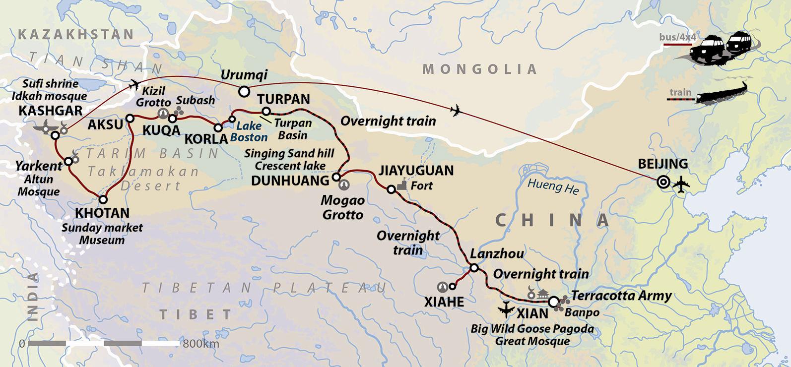 from £3250 excl. flights* The Silk Road has long passed into lore and legend. Connecting China with the unknown lands to the west, it once spanned great swathes of Central Asia, crossing nearly 6,500 kilometres of burning deserts and high mountain passes. This exceptional adventure takes us through some of the most culturally and geographically diverse landscapes along the Chinese section of the Silk Road; travelling through the harsh Taklamakan Desert to pick up both the more regularly travelled northern route, as well as the less travelled southern section. We’ll begin in Xian, home to the fabulous Terracotta Warriors and the easternmost point of the Silk Road, before moving on to explore the ancient cities that lay along its course. Along the way we will visit Tibetan Monasteries and ancient ruins, take in the Great Wall at Jiayuguan and explore the ancient Buddhist caves at Dunhuang and Kuqa. Crossing part of the Taklamakan Desert we then head for the southern trading centre of Khotan where we have a chance to enjoy its wonderfully chaotic and authentic Sunday market before heading to fabled Kashgar – the meeting point of both northern & southern routes - and the end of this remarkable odyssey. |
