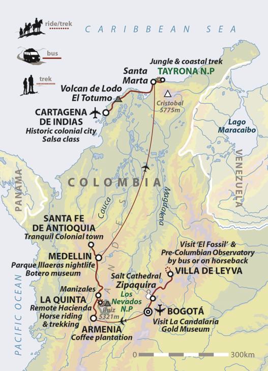 from £2650 excl. flights* It's no secret that Colombia gets our travel pulse racing. Packed with a wealth of heritage and natural wonders, the country has moved on leaps and bounds from its once nefarious past and boasts a dazzling array of landscapes from lush plantations to towering mountains, idyllic beaches and steamy rainforests. For the adventurous traveller, the attractions are numerous. On this trip we wander through the cobbled streets of Villa de Leyva and romantic Cartagena, and head far from the madding crowd to see all that the country has to offer. Going underground, we'll take in the spectacular salt cathedral at Zipaquira, explore - from our exclusive hacienda - the majestic countryside and villages of the coffee zone and discover the urban attractions of Medellin and Bogota.Indulging in a variety of activities from trekking in Tayrona National park, to wallowing in mud at the surreal mud volcanoes on the Caribbean coast, this tour offers visitors the chance to experience the diversity of the real Colombia and embrace the Latin spirit. |