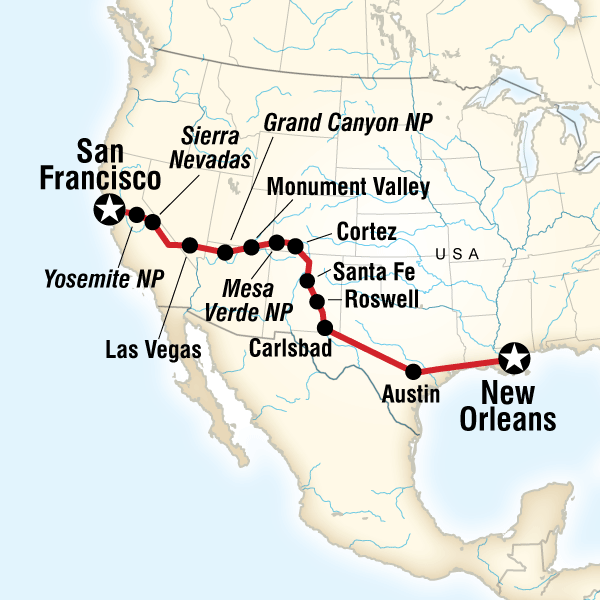 Bats in Texas, aliens in Roswell, pretty much everything else in San Francisco—get off the well-worn tourist trail and really discover the South and West of the United States. After leaving fabulous New Orleans, you'll explore some of the most incredible natural wonders anywhere—the Grand Canyon, Monument Valley, Yosemite—then trade wildlife for nightlife in Las Vegas. It's the ultimate roadtrip. Now, let's get rolling.