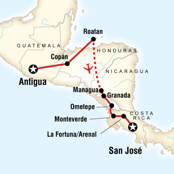 The popular route from Antigua in Guatemala to San Jose in Costa Rica takes in many of the highlights of Central America, from historical Mayan ruins and colonial towns to the Caribbean beaches, volcanoes and rainforests for which the region is famous. See full tour highlights