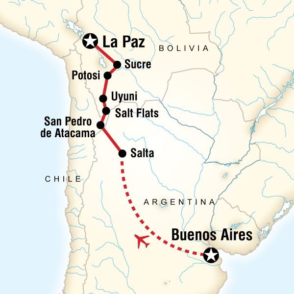 From La Paz high in the Andes, this route heads south through Bolivia and the Salar de Uyuni to the beautiful landscapes and fascinating cities of Chile and Argentina before crossing to the Atlantic coast and the great city of Buenos Aires. See full tour highlights