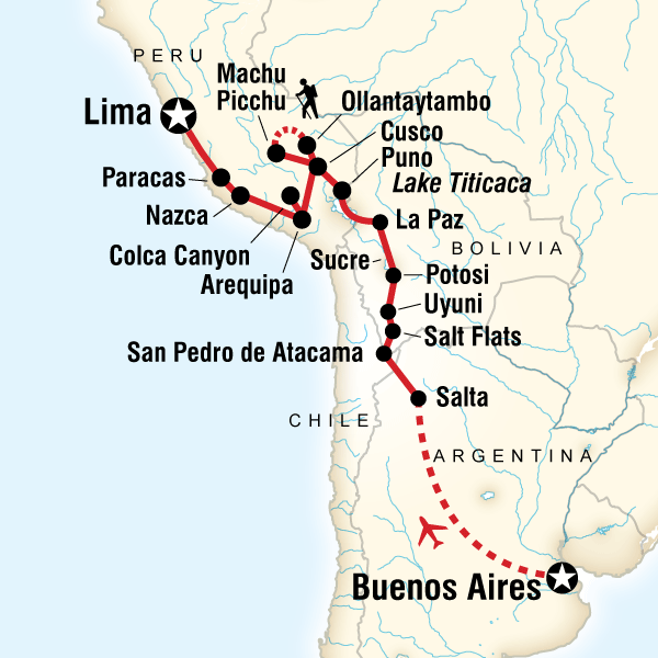 The Lima - Buenos Aires route travels through the popular traveller destinations in southern Peru and Bolivia before heading south to the thriving Argentine cities of Cordoba, Mendoza and Buenos Aires. See full tour highlights