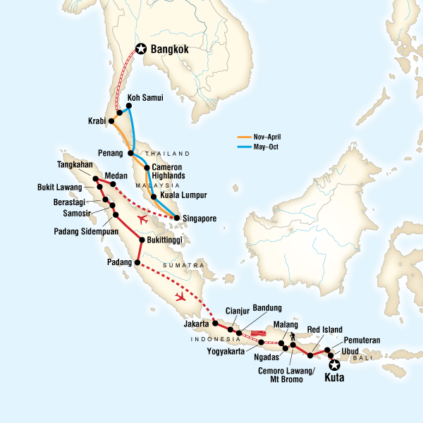 This extensive journey through Southeast Asia explores the cities, beaches and other attractions of southern Thailand and mainland Malaysia and then heads south from Singapore to the Indonesian islands of Java and Bali, famed for their beautiful natural landscapes and fascinating historical heritage. See full tour highlights