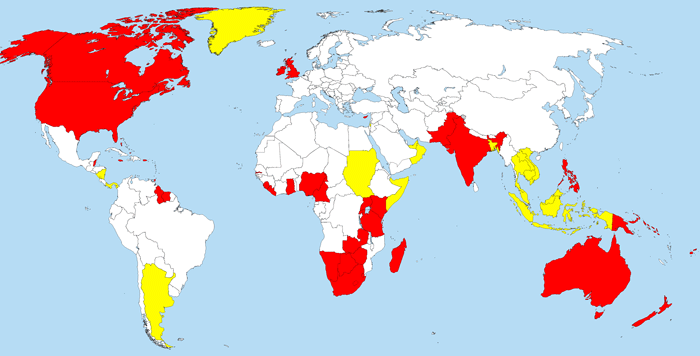 Welcome to the English language page on Frontiers of Travel where you will find resources to help you speak and communicate on your travels. English is spoken as a primary language in Antigua and Barbuda, Australia, Bahamas, Barbados, Belize, Botswana, Cameroon, Canada, Cyprus, Dominica, Federated States of Micronesia, Fiji, Gambia, Ghana, Grenada, Guyana, India, Ireland, Jamaica, Kenya, Kiribati, Lesotho, Liberia, Madagascar, Malta, Marshall Islands, Namibia, Nauru, New Zealand, Nigeria, Pakistan, Papua New Guinea, Philippines, Rwanda, Saint Kitts and Nevis, Saint Lucia, Saint Vincent and the Grenadines, Samoa, Sierra Leone, Singapore, Solomon Islands, South Africa, Suriname, Swaziland, Tanzania, Tonga, Trinidad and Tobago, Tuvalu, Uganda, United Kingdom, United States of America, Zambia, Zimbabwe, Anguilla, Bermuda, British Virgin Islands, Cayman Islands, Cook Islands, Montserrat, Pitcairn Islands, Puerto Rico, Tokelau, Turks and Caicos Islands, Virgin Islands, Sint Maarten, Falkland Islands (Islas Malvinas), Gibraltar, Guam, Hong Kong, Saint Helena, Ascension and Tristan da Cunha, South Georgia and the South Sandwich Islands, South Sudan and is spoken by a significant minority in Argentina, Bahrain, Bangladesh, Brunei, Cambodia, Indonesia, Laos, Libya, Malaysia, Mauritius, Monaco, Nicaragua, Oman, Palau, Panama, Seychelles, Somalia, Sudan, Thailand, Timor-Leste, United Arab Emirates, Vanuatu, Vietnam, American Samoa, Aruba, Gaza Strip, Greenland, Netherlands Antilles, Niue, Northern Mariana Islands, Saint Barthelemy, Saint Martin, West Bank, Curacao, Macau.