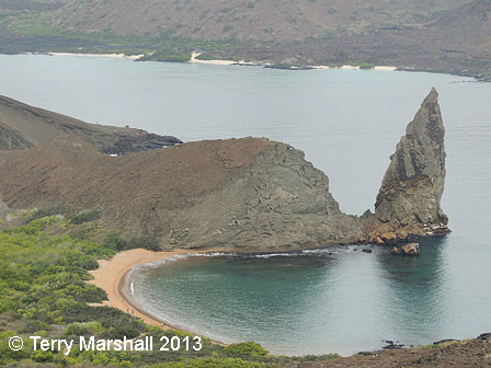 Bartolomé is located off the eastern shores of Santiago Island. A hike to the summit of the island (114m) provides a fantastic panoramic view which is amongst the best in Galapagos - the much photographed Pinnacle Rock (a volcanic tower rising out of the water), the island's lunar-like volcanic landscapes, the double-sided beach of Bartolomé below and Santiago in the distance. From the beach, there are great snorkelling opportunities among the submerged volcanic rock and near the tower base. On Bartolomé you may spot the rare Galapagos penguins, of which only 800 pairs exist, while marine turtles nest on the beach from January through March.